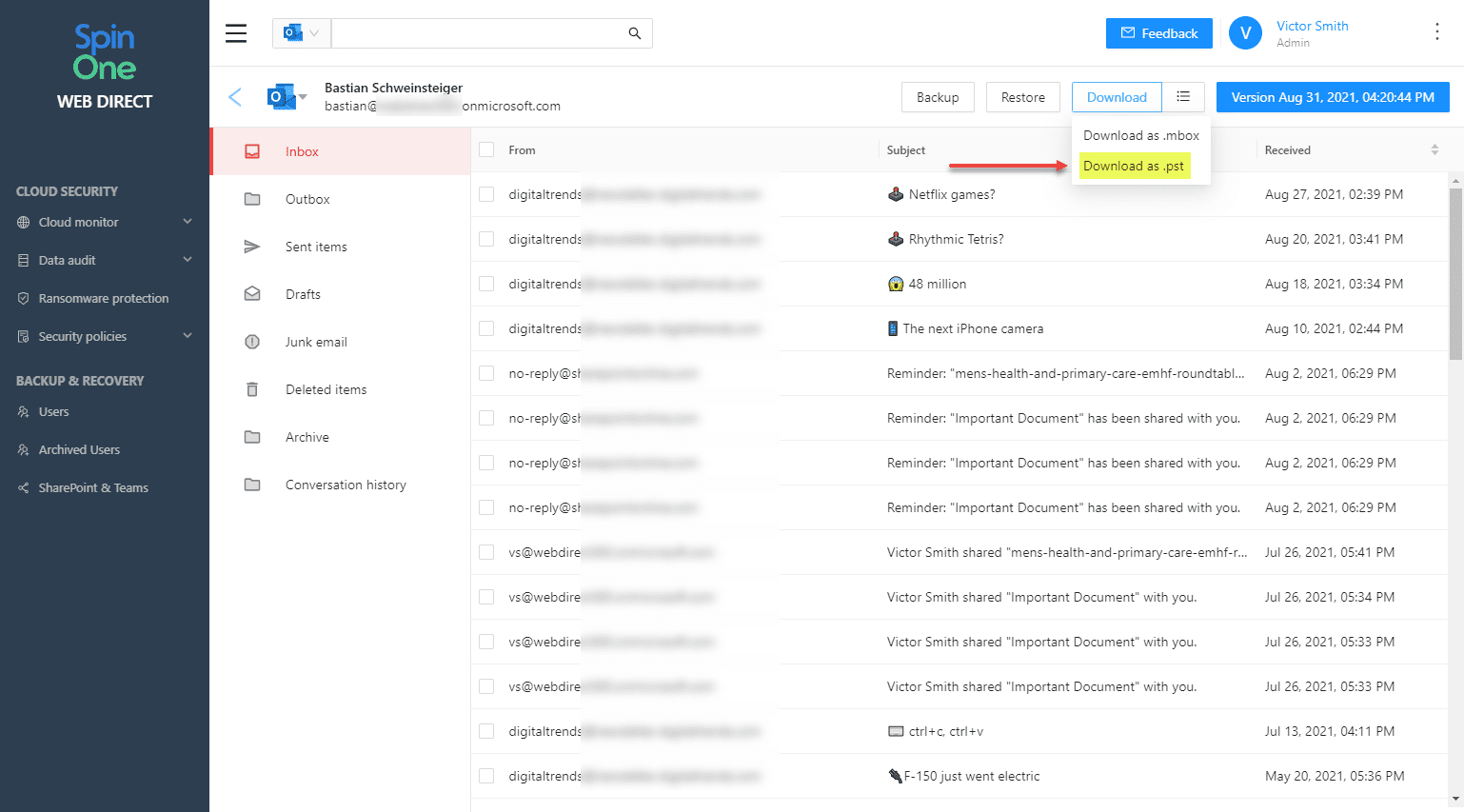 SpinOne makes it easy to export Exchange Online mailbox data to a PST file. PSTs are a standard file type used to export mailbox data as an archive, local storage, and other use cases.ย