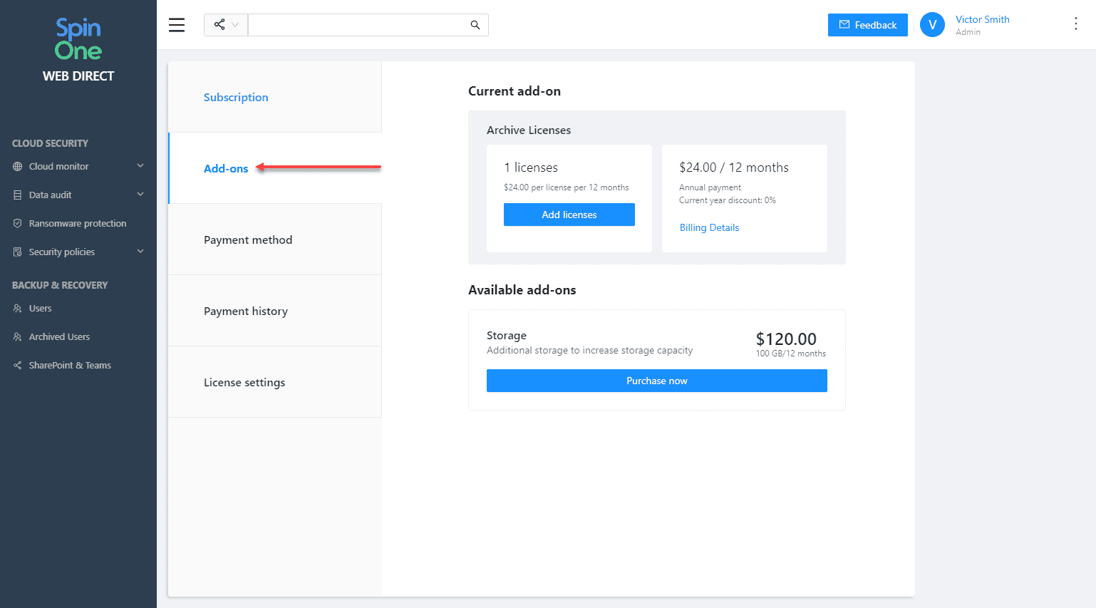 SpinOne has added an easy way to interact with and upgrade backend archive and storage licenses.