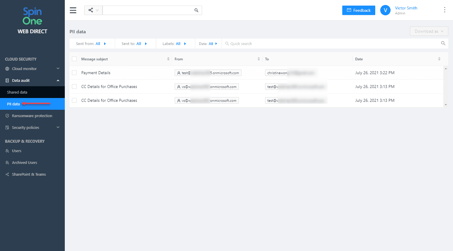 Using the PII dashboard you can have visibility to PII data contained in emails sent or received. SpinOne captures the information in redacted form.