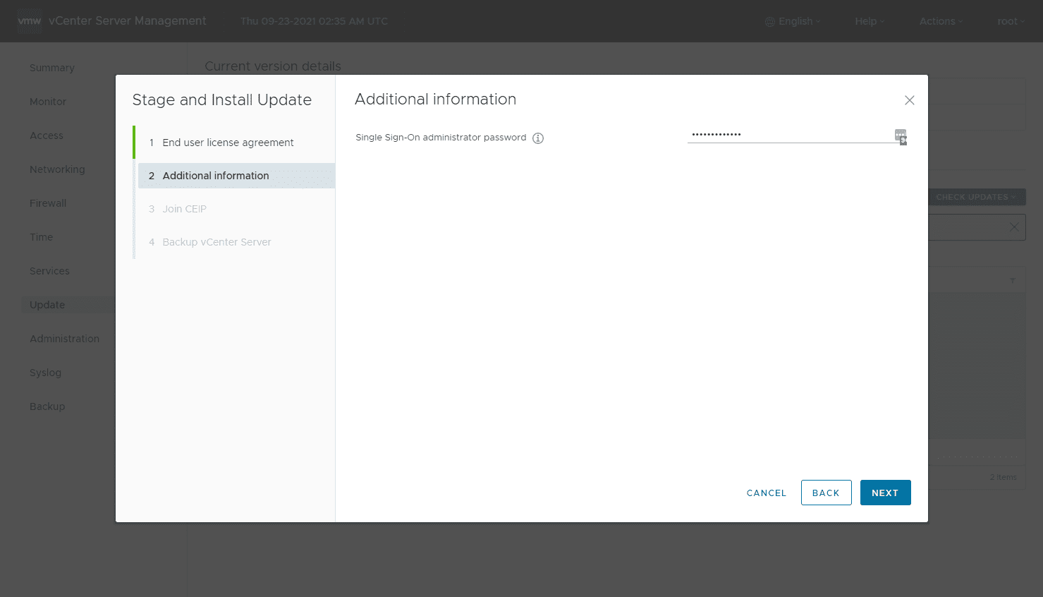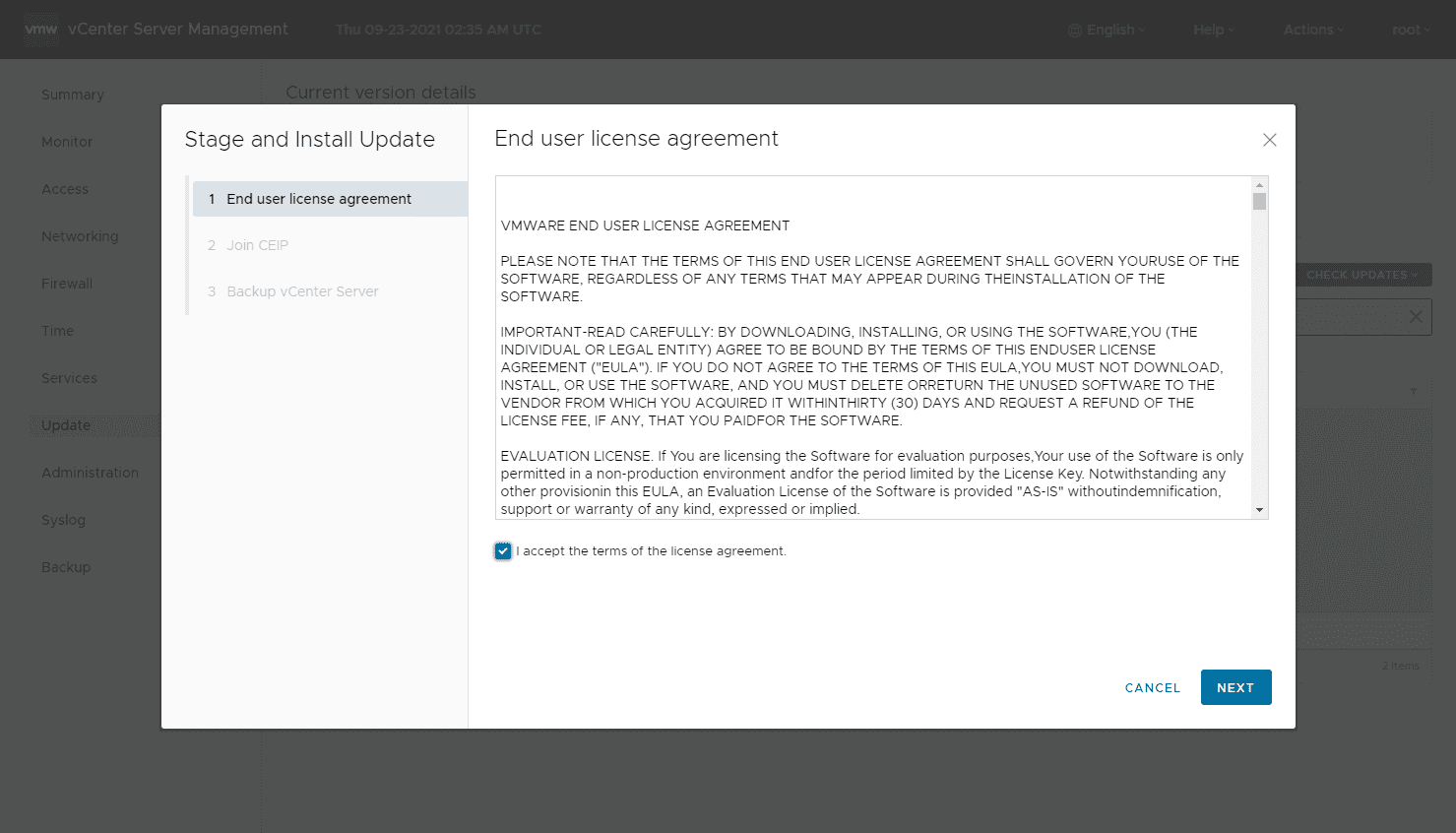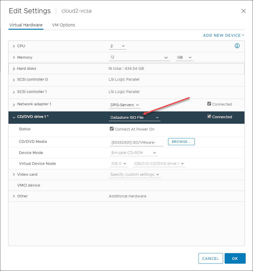 - Copy the ISO to a datastore or content library that you can mount to your VCSA appliance CD-ROM drive via the vSphere Client.