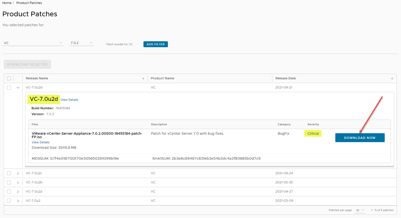- Download the Appliance patch ISO – https://my.vmware.com/group/vmware/patch