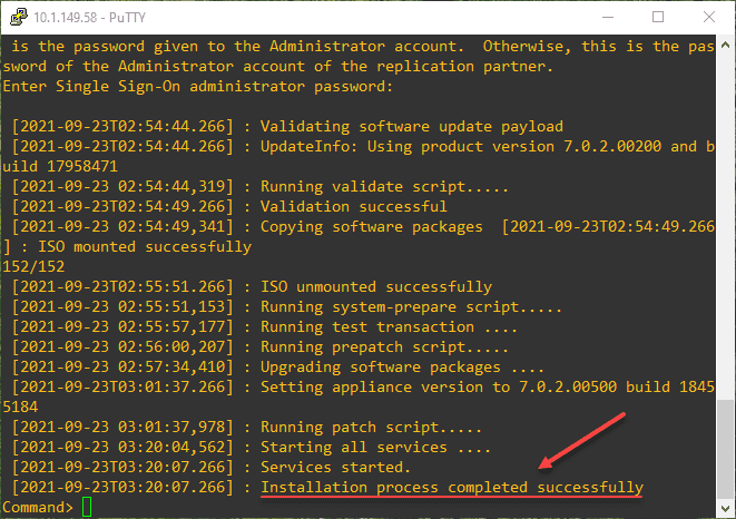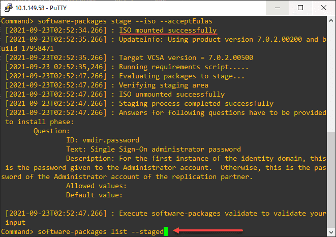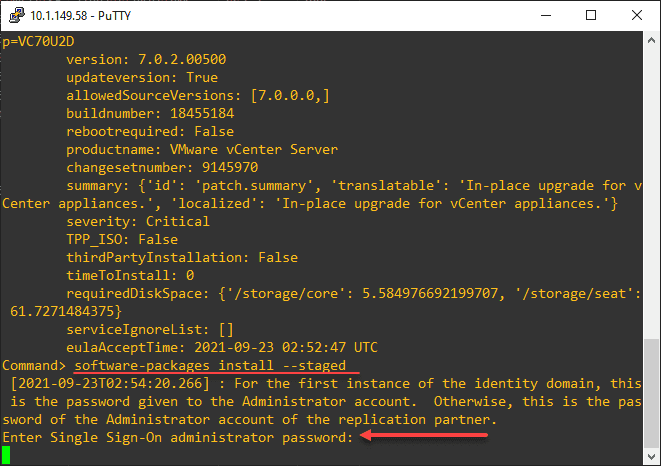 - Once the ISO file is mounted, SSH into the VCSA appliance and run the necessary commands to manually patch VMware vCenter Server VCSA with ISO that was uploaded