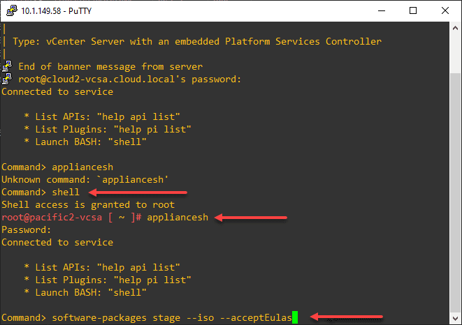 Below is a view of my running the commands listed above sequentially. First, SSH into the vCenter Server appliance and enter the appliancesh command.