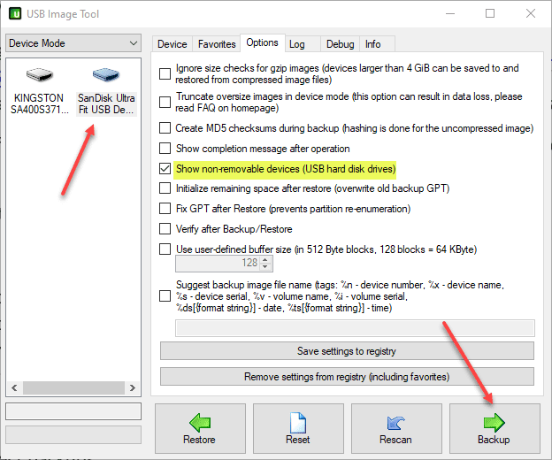 Now, with the hardware I needed, let’s look at the process to migrate from USB to SSD using the USB Image tool. Below is a screenshot of the USB Image Tool. As you can see, I have both the SanDisk Ultra USB (drive I am currently booting ESXi from), and the Kingston Drive showing (it is mounted using the external adapter I have listed above). As a note, you have to enable the option Show non-removable devices (USB hard disk drives) for your hard drive, mounted via an external USB adapter.