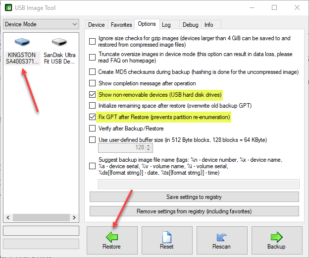 The process to restore the USB image to a USB-mounted SSD drive is straightforward. Click your USB-mounted SSD, then click Restore. Note the options checked in the Options tab.