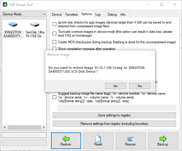 You will see a confirmation dialog asking you if you want to restore the image to the target device.