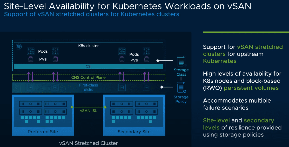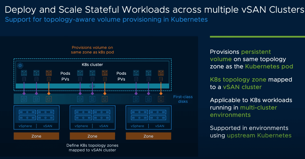 For multi-vSAN cluster environments, this can be valuable. Traditional vSAN clusters treat storage as an exclusive cluster resource. With topology-aware volume provisioning is used, pods can be scaled across clusters while ensuring they have access to their relative persistent volumes.