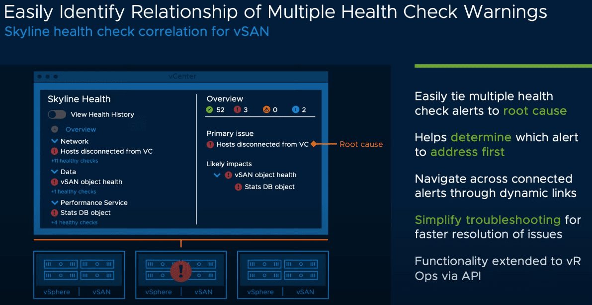 The Skyline Healthchecks for vSAN provides detailed health checks to catch the most common issues such as misconfiguration and failures. New to vSAN 7 Update 3 is the ability to understand the relationship of one health check to another for effective troubleshooting. This correlation between triggered health checks helps to find the root cause more quickly. This functionality is also exposed via API as well. This allows it to be used in solutions such as vRealize Operations.