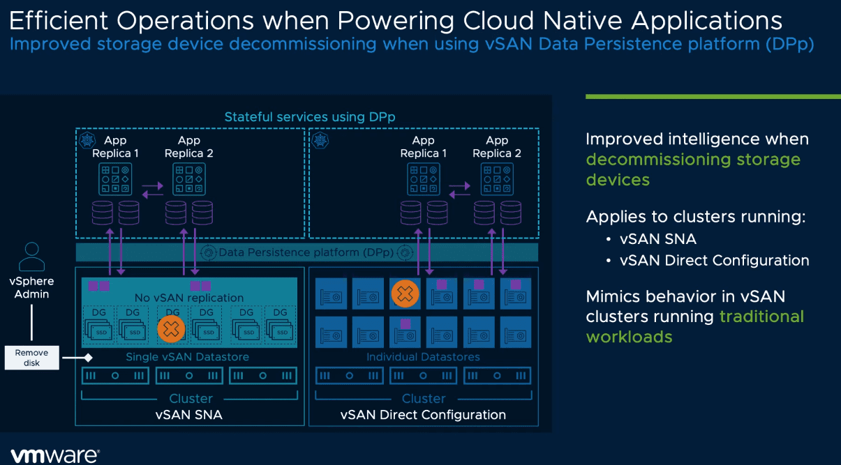 The data persistence platform (DPp) is the framework that helps integrate stateful applications in a vSAN environment through easy installation in vCenter. VMware vSAN Update 3 introduces new capabilities that help with storage device decommissioning as well as management of persistence services operators. VMware vSAN clusters that use the data persistence platform will now be able to decommission discrete devices more easily, similar to vSAN clusters running traditional workloads. It minimizes the cost of data movement when compared to host-based evacuation.