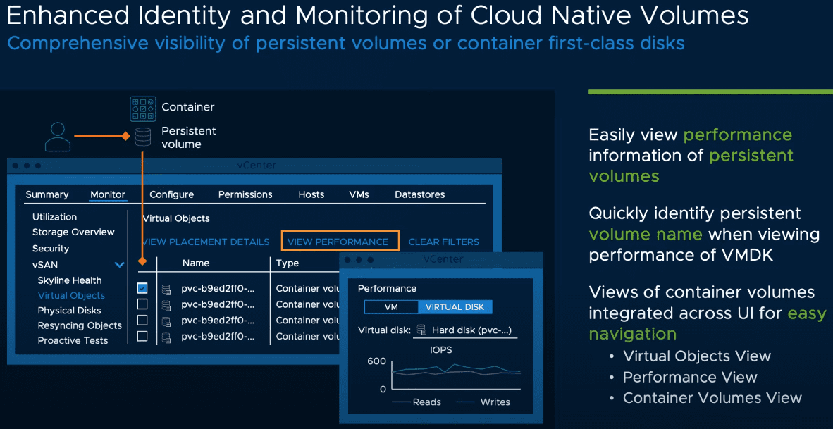 Many environments are adopting applications that are built-in containers and used for persistent volumes. To ensure these are treated as “first-class citizens,” vSAN 7 Update 3 introduces enhanced levels of visibility for persistent volumes. You can now consistently view the persistent volume name when viewing logs and drill down for performance in looking at persistent volumes. The user interface has been reworked with comprehensive crosslinked information for easy navigation.