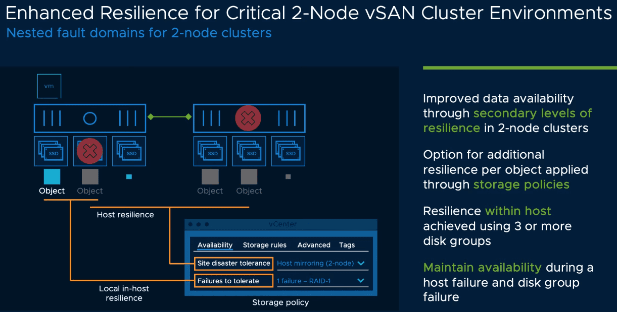 Two-node can now offer a secondary level of resilience when they have three or more disk groups in the host. It means a topology can suffer an entire host failure and the failure of a disk group on the remaining host and still provide full data availability.