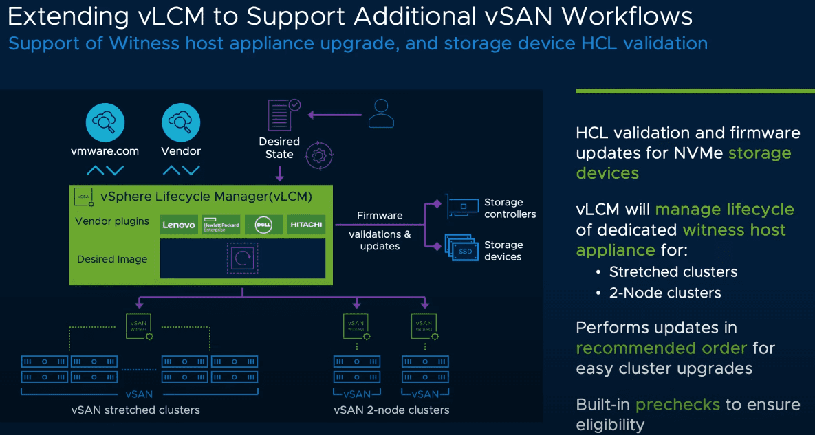 VMware vSphere Lifecycle Manager (vLCM), has introduced all new levels in the management of ESXi hosts that participate in vSphere and vSAN clusters. VMware vSphere 7 Update 3 introduces enhancements for vSAN topologies that use dedicated witness host appliances. Both stretched clusters and two-node environments that use their own dedicated witness host appliances will now be managed and updated by vLCM. This is important to guarantee a consistent and desired state of all hosts used in the cluster. It includes built-in prechecks and performs these updates in the recommended order to ensure availability.