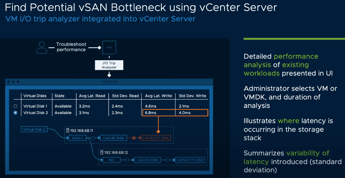 Understanding potential performance bottlenecks in distributed storage systems can be challenging. VMware vSAN 7 Update 3 introduces VM I/O trip analyzer to help administrators to identify the primary points of contention more easily. With the ability to visualize parts of the data path directly from vSphere Client UI, admins are presented with a simplified overview that helps to indicate the cause. Not only does it have a visual data path, but it measures the variability or standard deviation of the latency in the system. It helps answer the questions of performance and performance consistency.