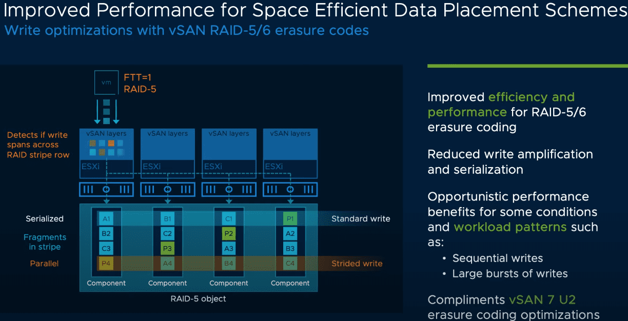VMware vSAN 7 Update 3 now evaluates characteristics of the incoming writes in the queues and now can write the stripe with parity in a more efficient way, reducing I/O amplification and the number of tasks occurring in a serial manner. The optimizations are particularly beneficial for workload patterns that issue sequential writes or “bursty” write workload activity found in database or streaming application workloads. This combined with RAID-caching enhancements is an example of the performance tuning VMware is delivering on existing hardware that you already have.