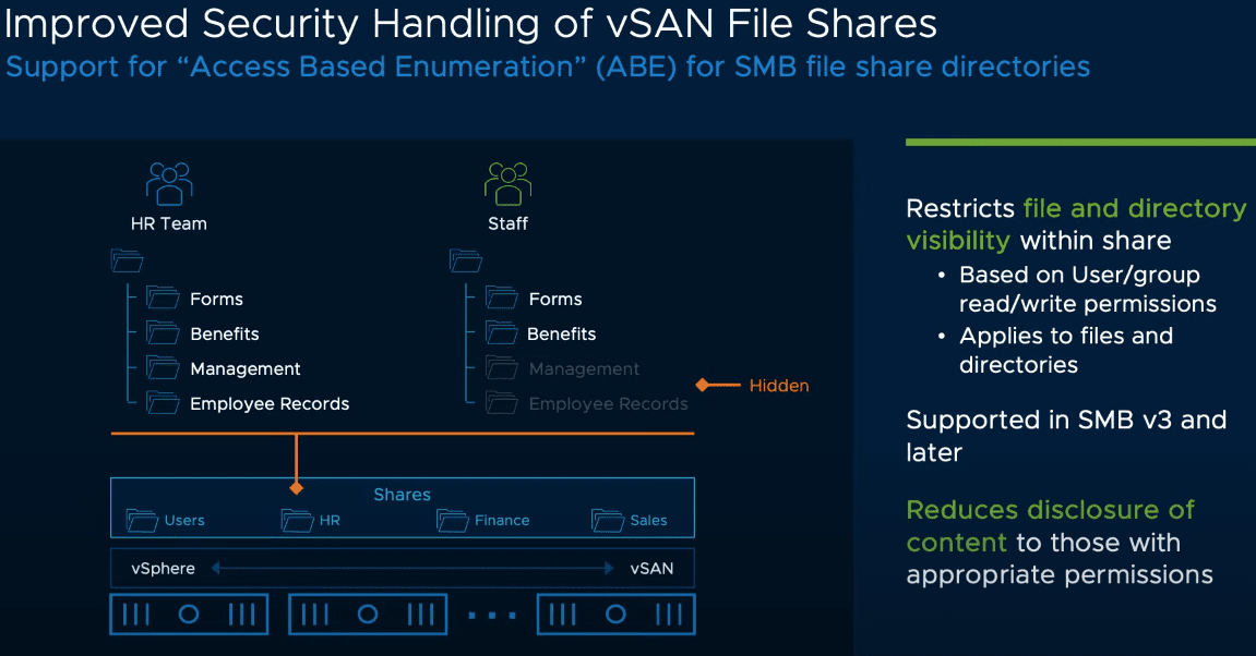 With vSAN 7 Update 3, vSAN file services introduce support for a technique of intelligent disclosure known as “access-based enumeration” (ABE). This feature capable with file systems using SMB3 and newer will reduce the disclosure of content to only those with the proper permissions.