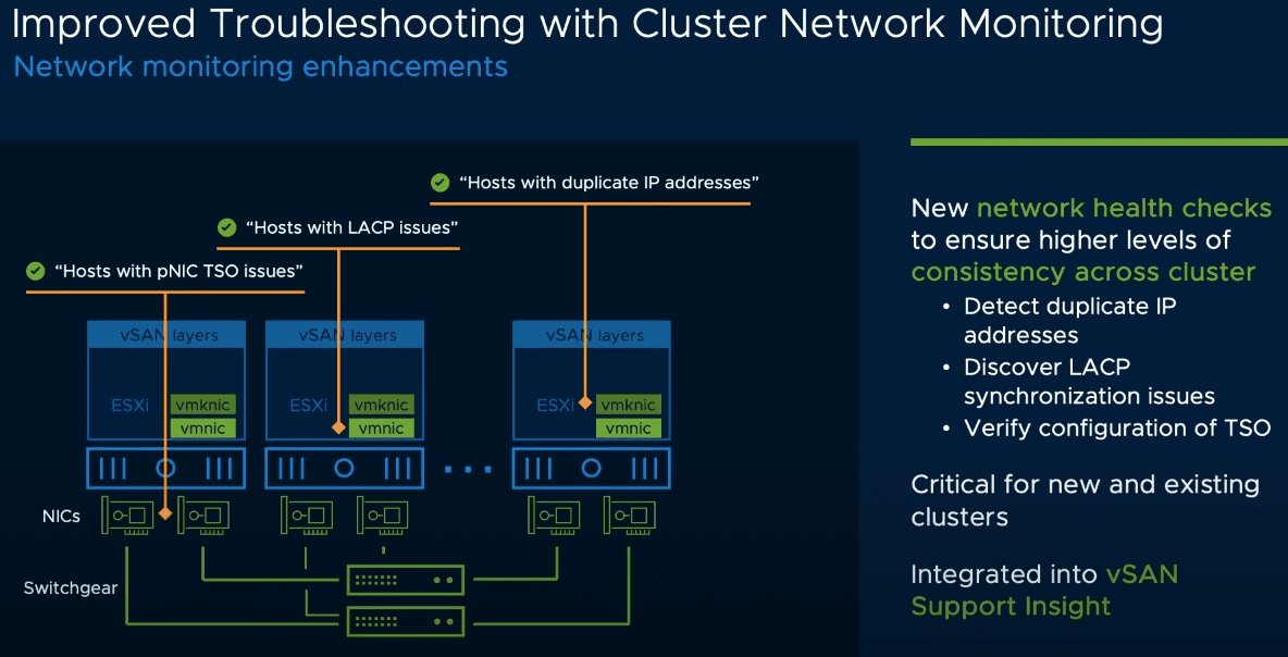 Understanding network health and performance is extremely important in HCI solutions like vSAN. VMware vSAN 7 Update 3 introduces new metrics and health checks to provide better visibility into switch fabric that connects vSAN hosts and ensures a higher level of consistency. Duplicate IP detection is now a part of the health checks and the discovery of LACP synchronization issues.