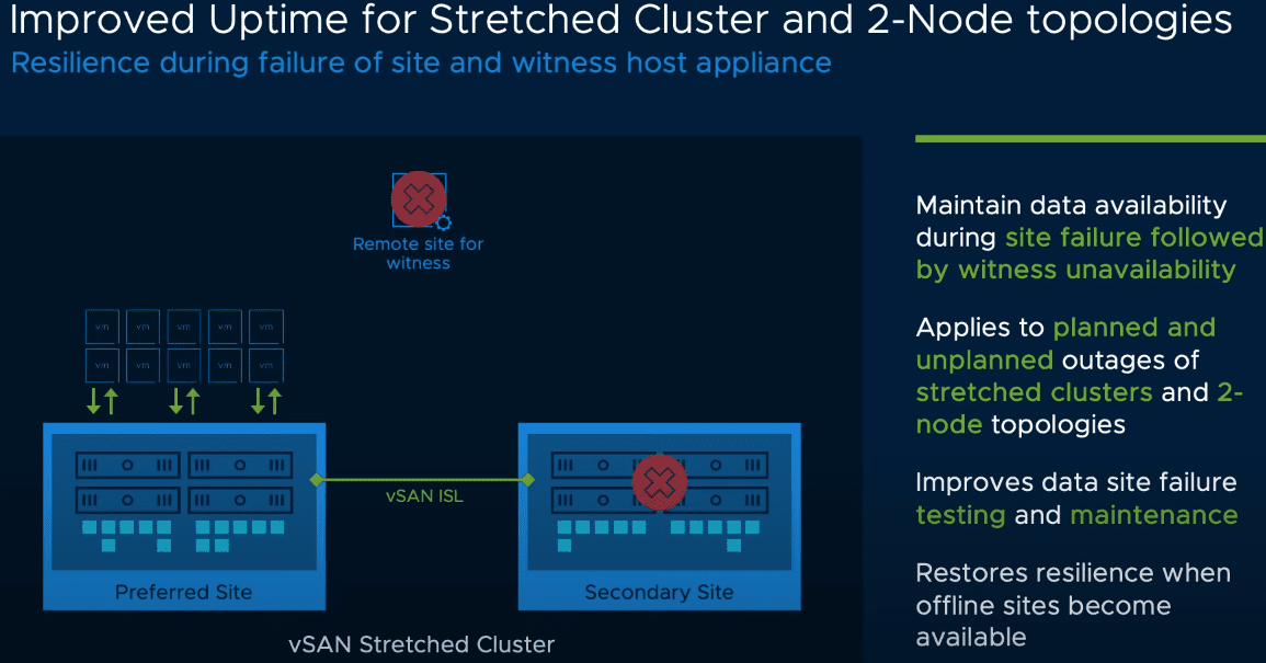 VMware vSAN stretched clusters provide full resilience of an environment, even if a geographical site is unavailable for some reason. VMware vSAN 7 Update 3 increases the availability of data if one of the data sites becomes unavailable followed by a planned or unplanned availability of the witness host appliance.