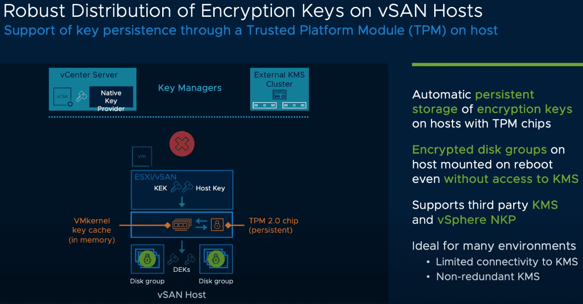 VMware vSAN offers encryption services to help ensure the integrity of data stored in the environment. For vSAN at-rest data encryption, key management can occur using the vSphere native key provider or an external KMS. VMware vSAN 7 Update 3 introduces the ability to use Trusted Platform Modules (TPM) on one of the hosts in the vSAN cluster to persist the encryption keys should there be an issue with communication to the key provider.