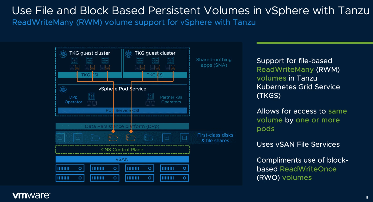 VMware vSAN 7 Update 3 introduces all-new flexibility and scalability for organizations running containerized workloads on top of vSphere with Tanzu. The use of file-base read-write many volumes is now supported in vSphere with Tanzu, in addition to the block-based read-write once volumes. This provides new flexibility and efficiency for microservices. You can simply mount and access the same persistent volume as other pods in the cluster. Read-write many volumes can be exposed to TKG guest clusters using vSAN File Services.