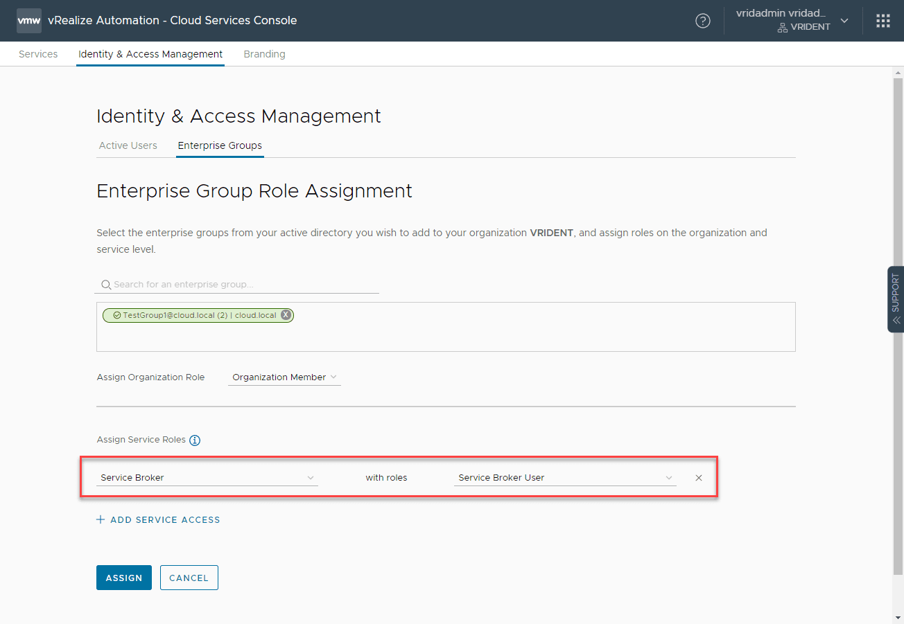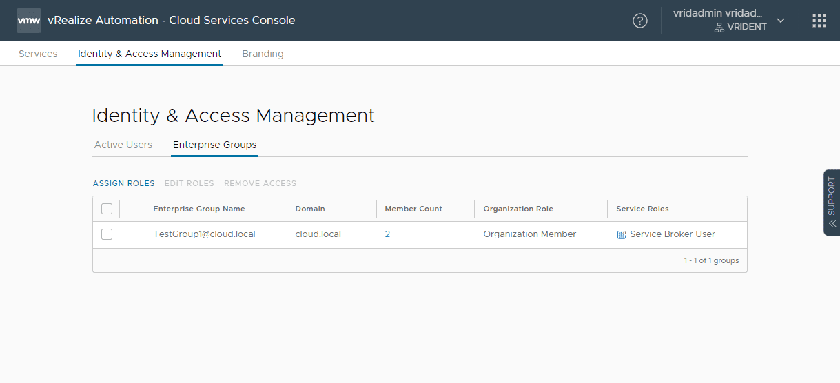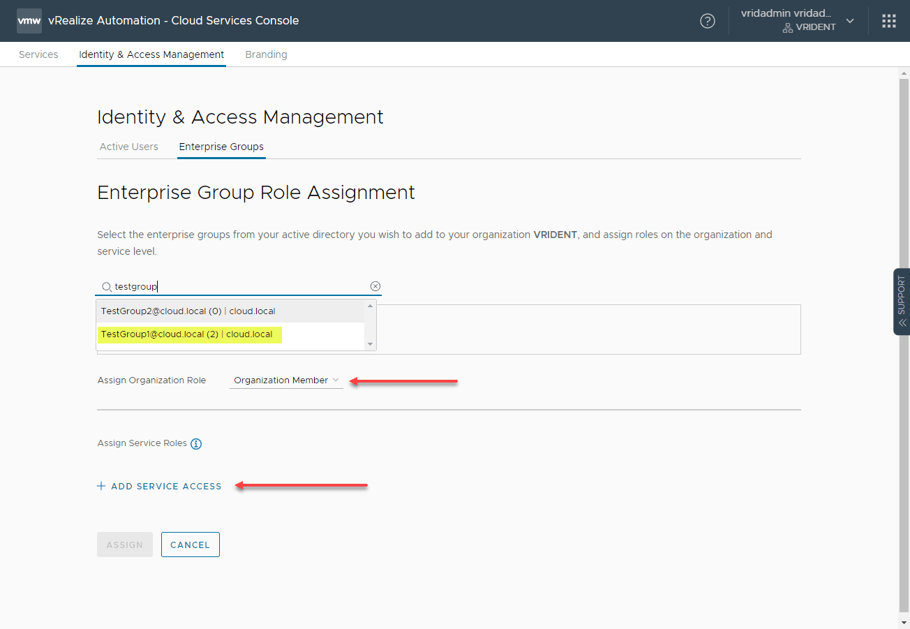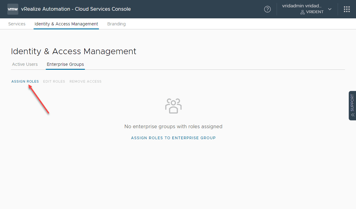 Go to Administration > Identity and Access Management Enterprise Groups to add a group from Active Directory to a vRealize Automation role. Click the Assign Roles link.