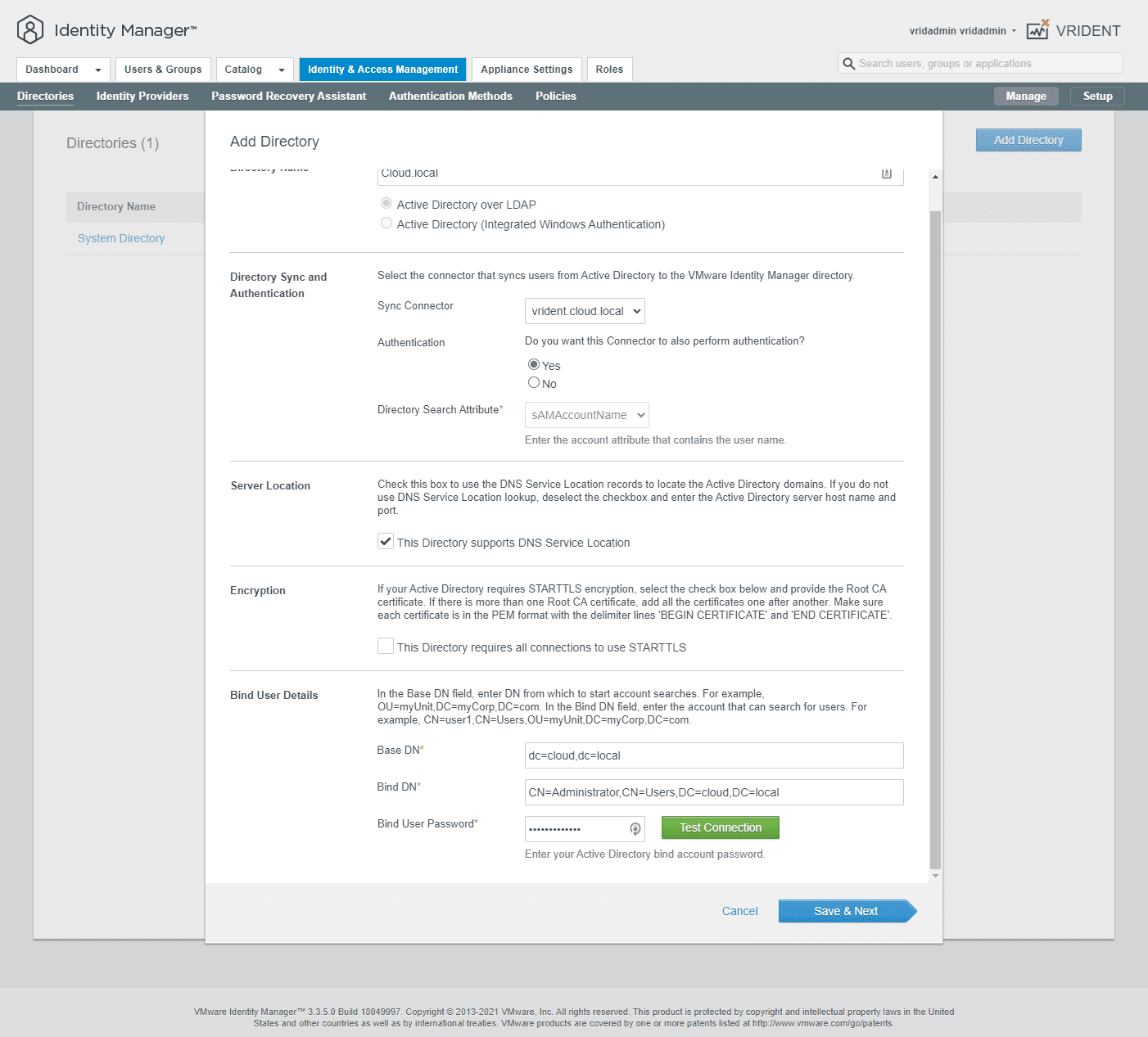 Navigate to Directories > Add Directory in VMware Identity Manager. Select LDAP Directory. Fill in the pertinent information for your directory. Also, set the Bind user details which is a user with the permissions to view Active Directory. For ease in the lab, I am using an administrator user. However, in production, you will want to create a service account for this purpose.
