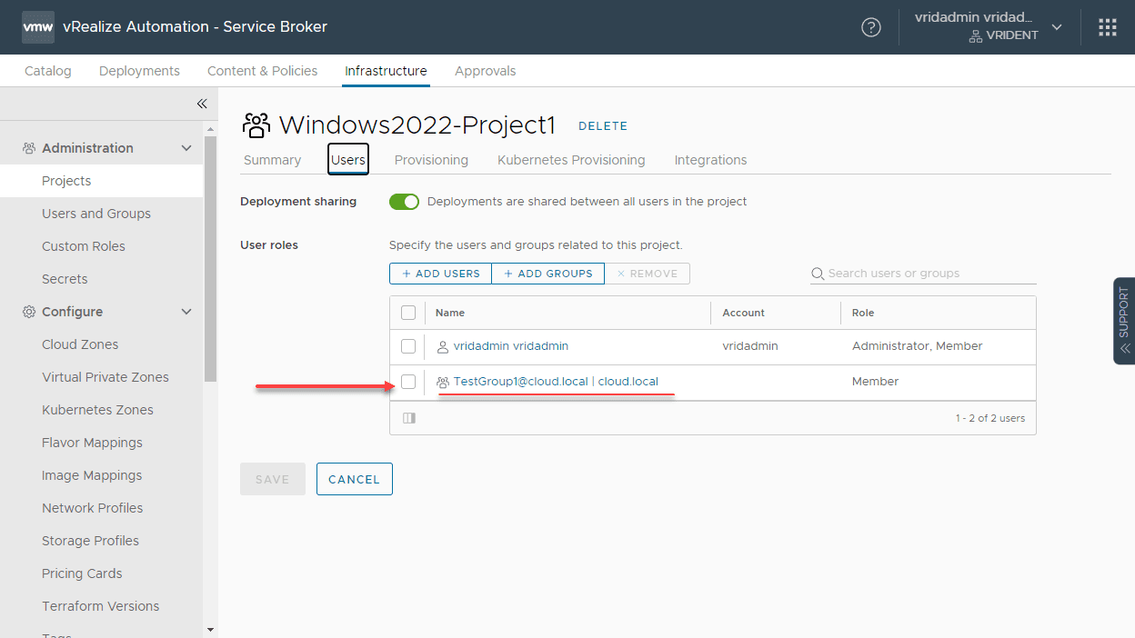 The final step after we have added our Active Directory LDAP directory to VMware Identity Manager and created a project to work with provisioning vSphere resources is to add the Active Directory group we want to have access to perform self-service actions to the Service Broker.