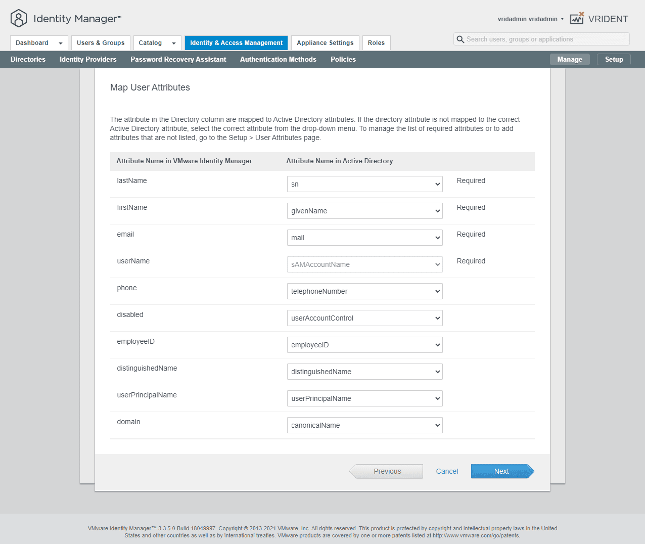 VMware Identity Manager has four attributes that are required for mapping a user and importing them. As you can see below, these are: