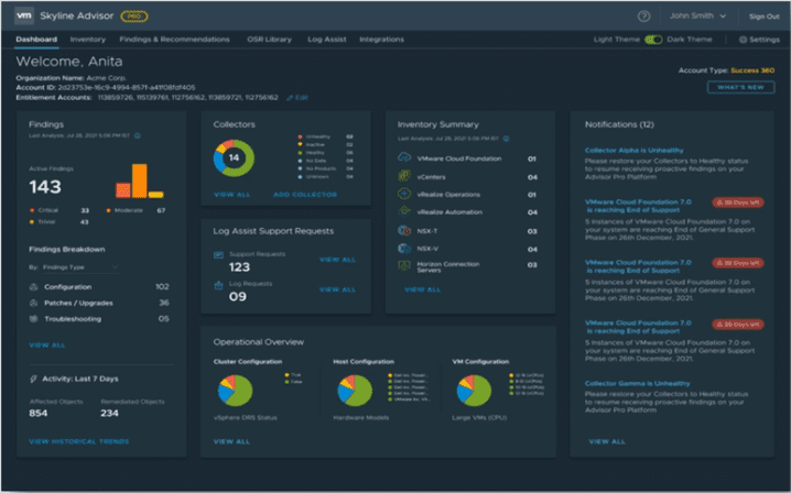 - Smarter – VMware Skyline Pro offers more intelligence. There are two new insights features, including end of life and historical insights. Success 360 customers get access to exclusive features, including a new proactive insights report and you get access to a VMware expert who can provide remediation guidance.