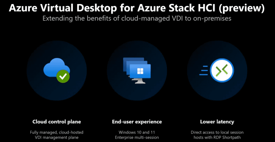 One of the most popular workloads running in Azure is the Azure virtual desktop service, previously known as Windows Virtual Desktops. With Azure Stack HCI 21H2, the Azure Virtual Desktop for Azure Stack HCI is coming very soon. With the Azure Virtual Desktop service for Azure HCI, you can extend the benefits you love about cloud-managed VDI to your on-premises environment. The control plane for the Virtual Desktop continues to run in the public cloud. You don’t have to worry about setting it up or maintaining it. But, your desktops and session hosts can run outside of Azure on Azure Stack HCI. So, you deliver the same end-user experience that your users expect and love from Microsoft, including Windows 10 & 11 enterprise multi-session.