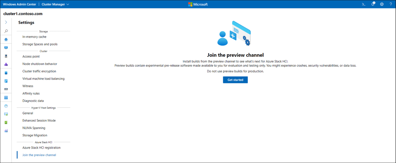 - Connect to the Azure Stack HCI cluster on which you want to install feature updates, and selectย Settingsย from the bottom-left corner of the screen. Selectย Join the preview channel, thenย Get started.