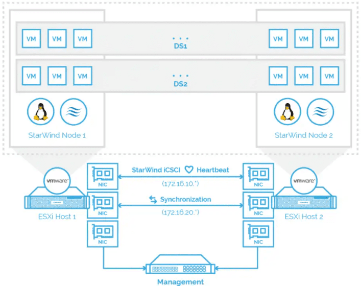 StarWind Virtual SAN (VSAN) is provided as a lightweight Linux-based VM created to lower the TCO for ROBO & Edge. It allows customers to achieve a high level of performance, availability, and resiliency with limited resources. It works by mirroring internal hard disk and flash between VMware ESXi servers, creating a single fault-tolerant storage pool for seamless infrastructure performance.