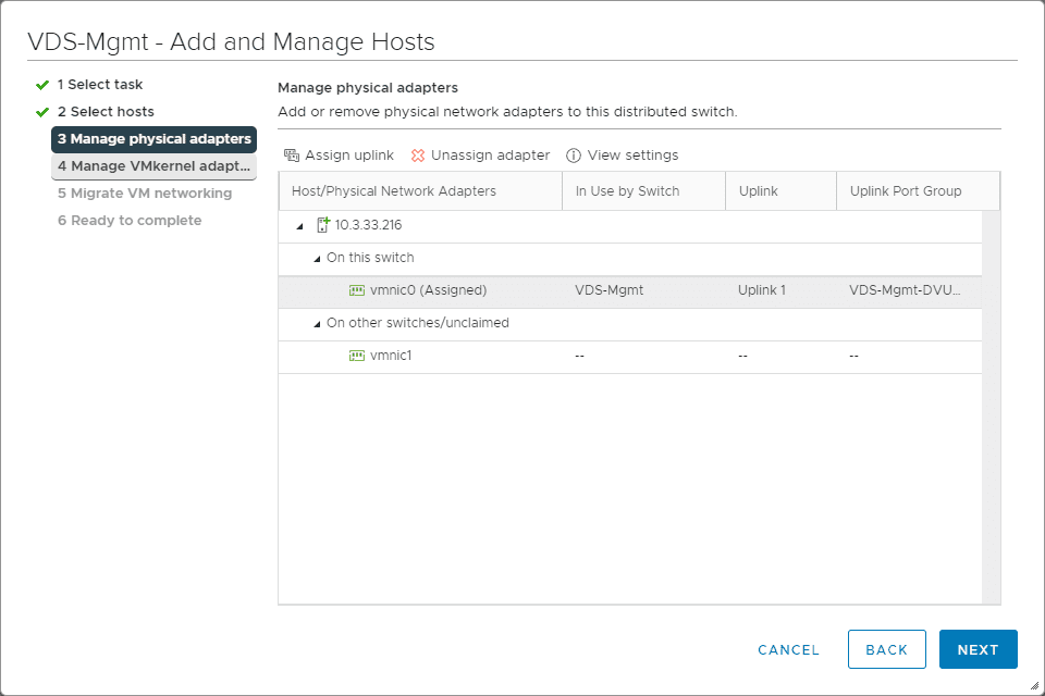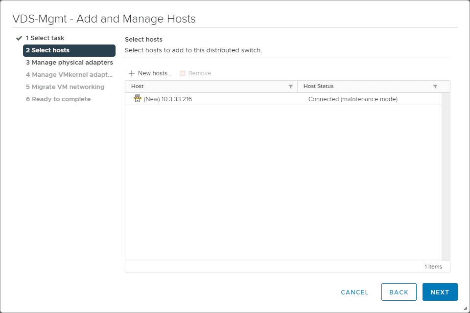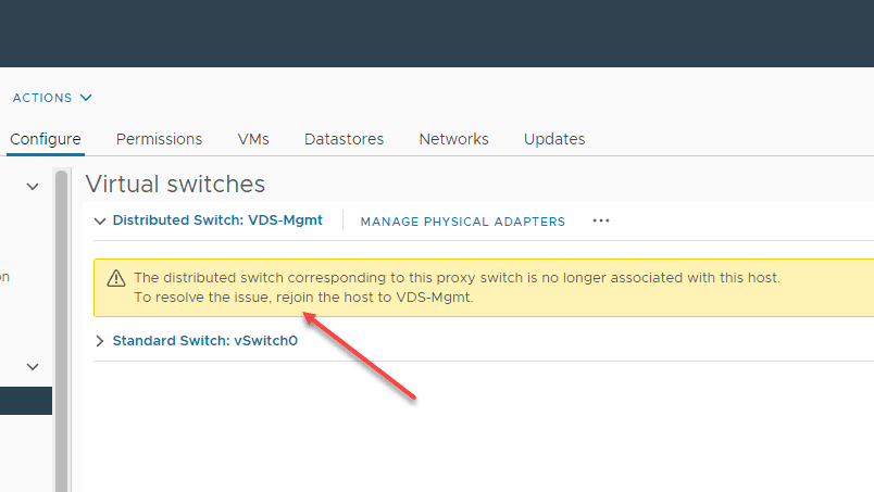 After you add the ESXi host back to your vSphere inventory, you will need to reconcile your VDS switch. In my environment, I found that simply adding the switch back to the changed IP host correctly resolves VDS host proxy switch issues. You may see the below when the host is added back to vSphere inventory.