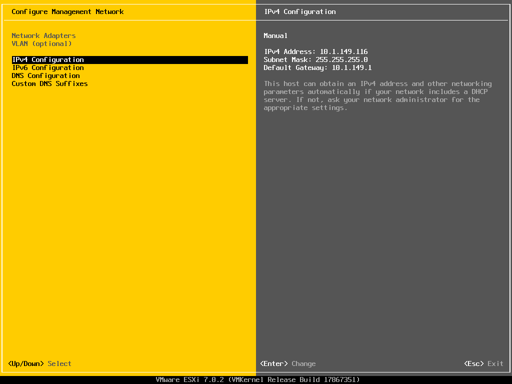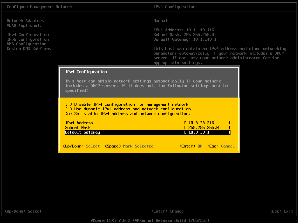 The steps are fairly straightforward to change IP ESXi. There are a few things to be aware of. It does make things a bit more tedious if a host is a member of a vSAN host and if it is running a vSphere Distributed Switch. These are the steps I used to change the IP for VMware ESXi that was running as part of a vSAN host.