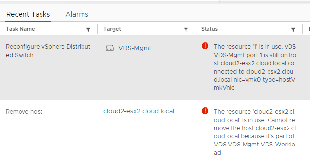 One sticky part of the vSphere Distributed Switch that can be a bear is removing the switch from the host altogether. You may run into issues with “resources in use” when trying to remove the switch from the host as shown below.