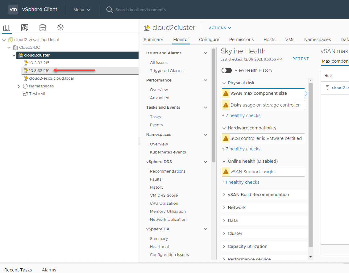 Another issue, on one of the hosts I wasn’t paying attention as I was performing other lab tasks and I removed the host from vSphere inventory without first taking it out of the vSAN cluster. This resulted in a cluster partition on the host, even though I had network connectivity between the host and vCenter. I had to leave the cluster once again and bring the host back into the vSAN-enabled cluster to rejoin it properly.