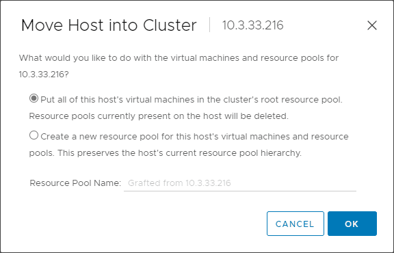 The next step is to move the ESXi host out of the vSAN-enabled cluster. This effectively disables vSAN for the host. You need to perform this step as you will run into issues if you just remove the host with vSAN enabled from vSphere altogether, change the IP and then bring it back in.