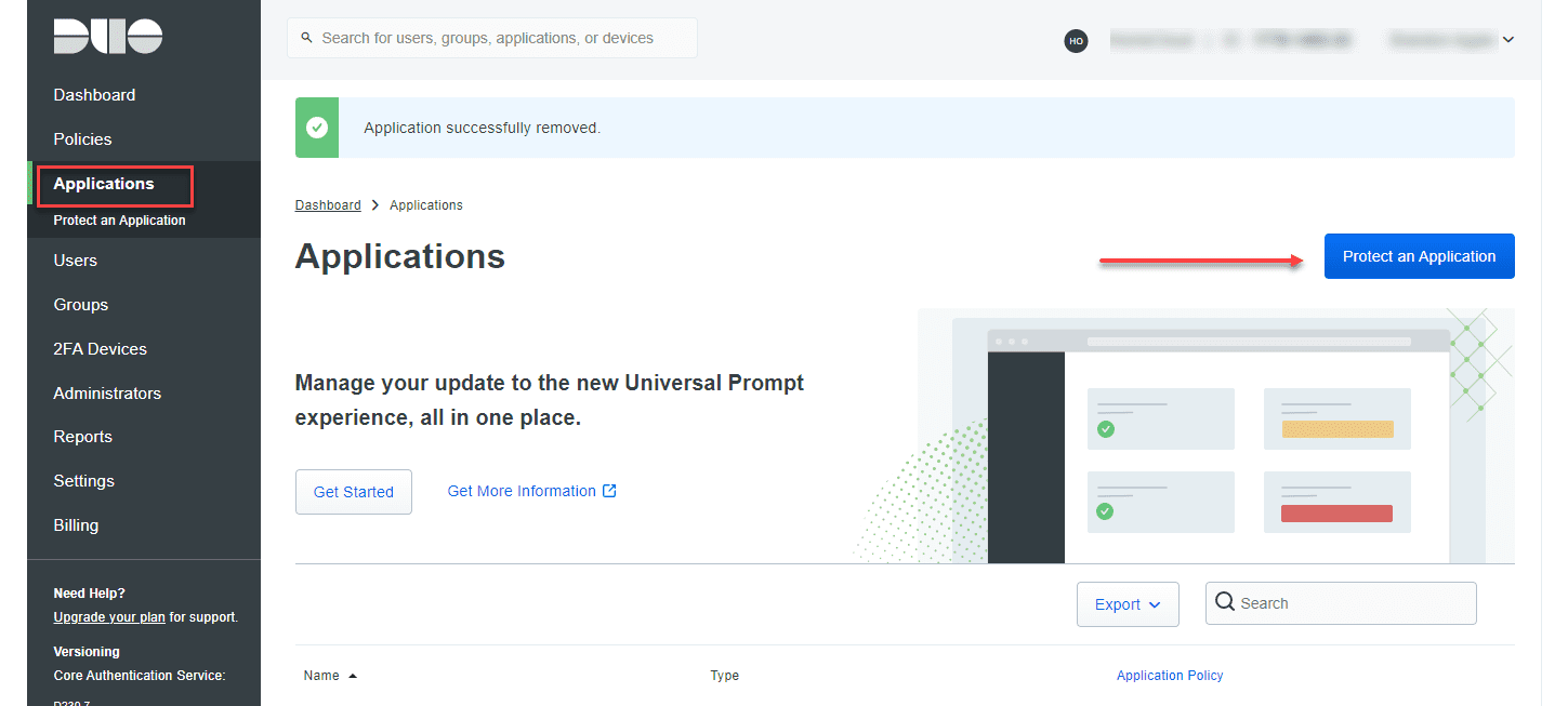 After logging into your Duo account, navigate to your Applications and Protect an Application button.