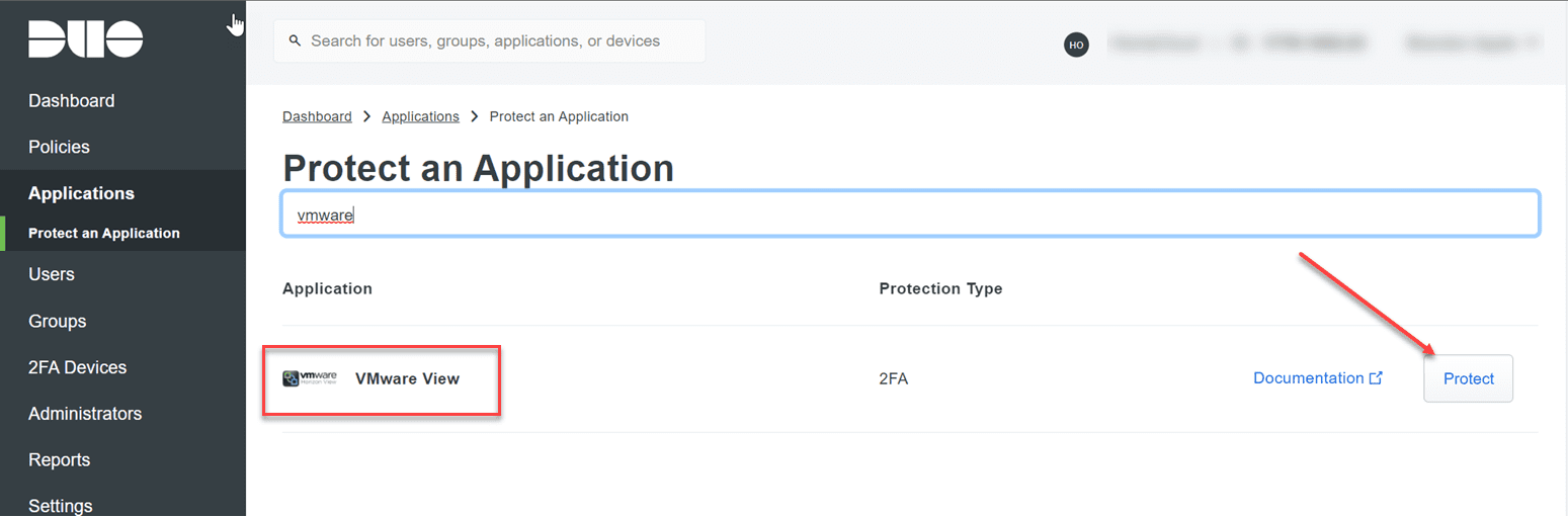 Search for VMware View. Since there isn’t an application in the catalog for vCenter Server, the VMware View app works just fine. There is nothing really specific to VMware Horizon with this particular Duo app. We simply need an application that sends LDAP credentials to the Duo cloud and verifies access by sending the two-factor authentication prompt. Click Protect to begin creating the new protected application.