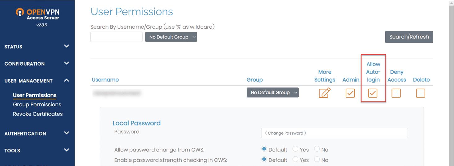 The other thing you want to configure is the Allow Autologin checkbox. This allows the user to autologin using the config.opvn file we will download in the next step.