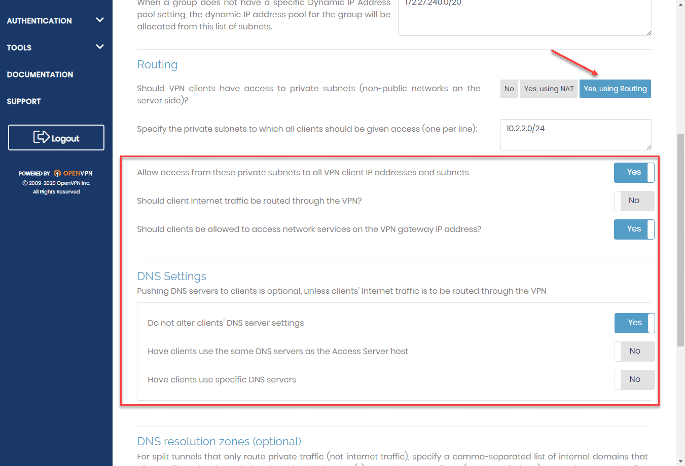 - Routing is set to Yes, using routing and the “server-side” subnets are defined that clients can access. Note, this is on the Access Server side.