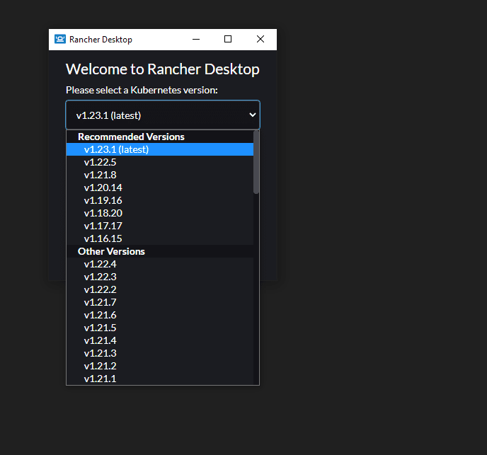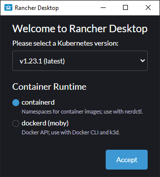 Once Rancher Desktop is installed and you left the Run Rancher Desktop option selected, you will see the Rancher Desktop Kubernetes configuration dialog box launch. In this configuration dialog, you can configure the version of Kubernetes you want to run and the container runtime used to run it. Here, I am leaving the defaults selected (v1.23.1 (latest) Kubernetes and containerd).