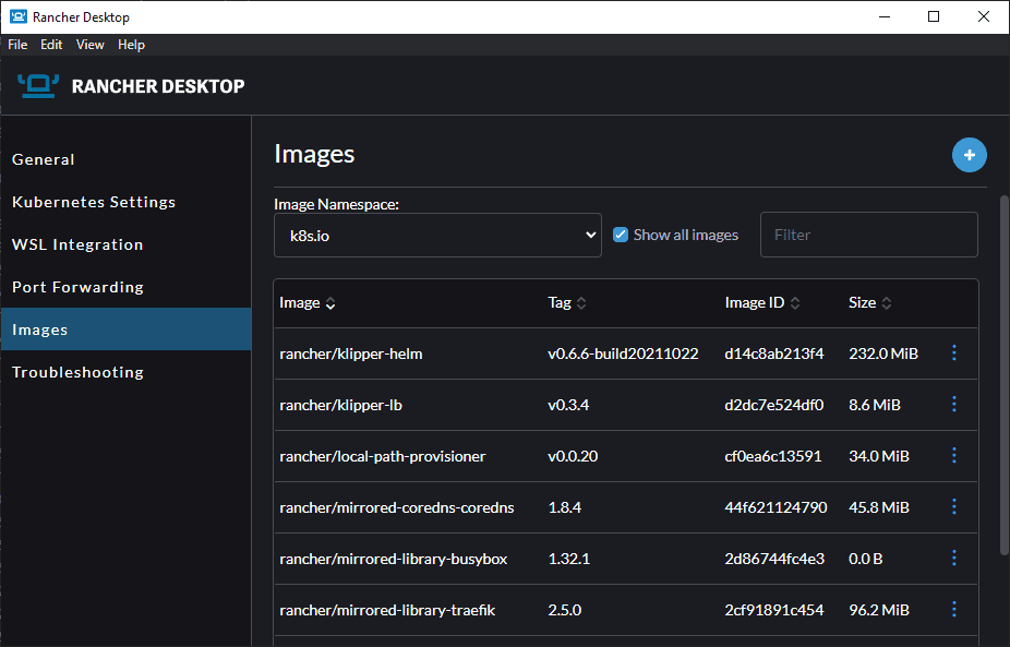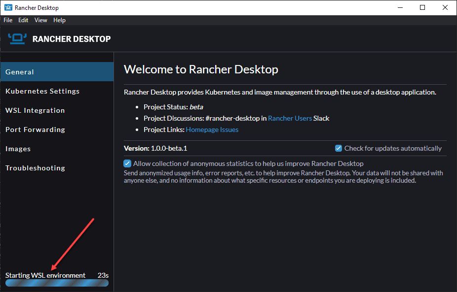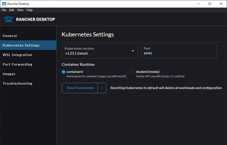 Let’s go through the configuration screens available in Rancher Desktop while the WSL environment is prepared (doesn’t take long). On the Kubernetes settings screen, you see the various information configured at the outset with the version of Kubernetes and container runtime selected.