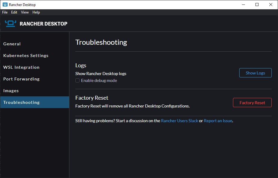 On the Troubleshooting page, you can view logs and also reset the environment back to its factory configuration if you encounter issues.