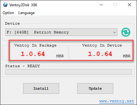 If you relaunch the Ventoy2Disk.exe utility, you will see the version of the utility compared to the version of Ventoy installed on the USB drive.