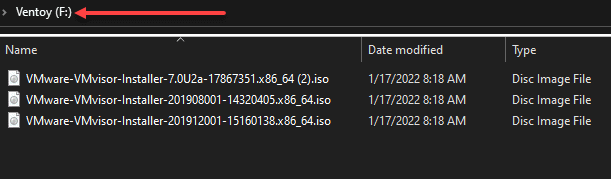 Now, the rest is simple. All you need to do at this point is copy over the ISO images you want to use on the USB key. Below I have downloaded ESXi 7.0 U2, ESXi 6.7, and ESXI 6.5 to the root of the USB key.