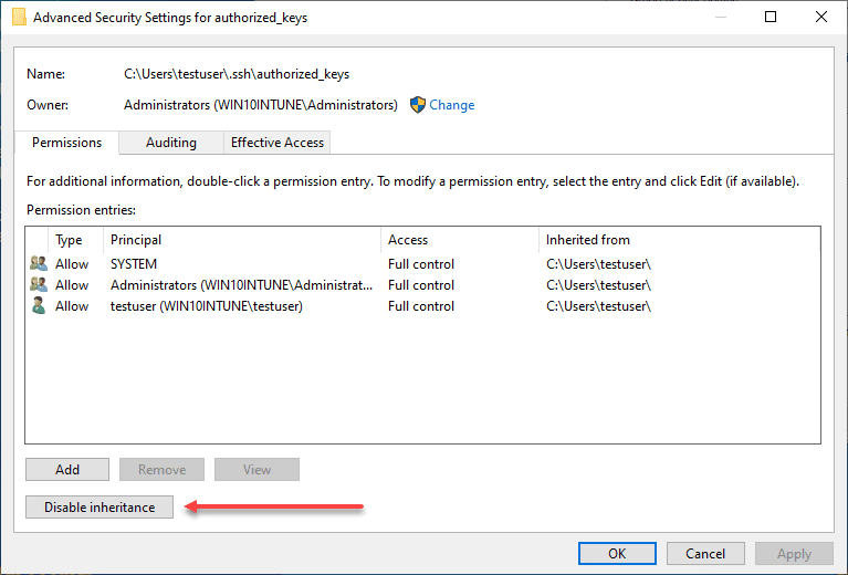 Part of the process to properly configure your Windows 10 SSH session for public-key authentication is ensuring the permissions are set correctly, both on the authorized_keys file (holds public key) and the private key file that holds the private key side of your key pair. Let’s take a look at both.