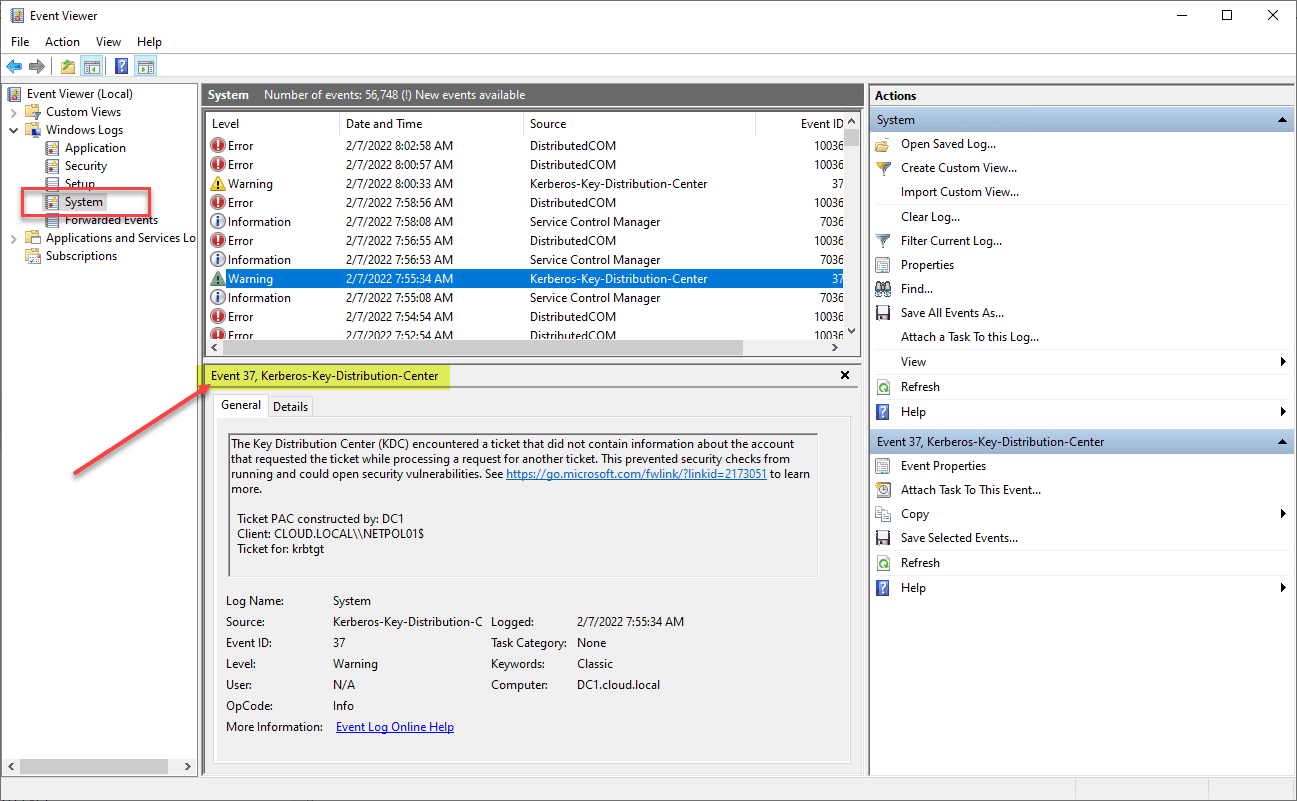 - EventID 37 – The KDC encounters a TGT or other evidence ticket without the PAC Requestor buffer. It is likely that the KDC that constructed the PAC does not contain the update or is in Disabled mode. Warning during Deployment Phase, Error during Enforcement Phase.