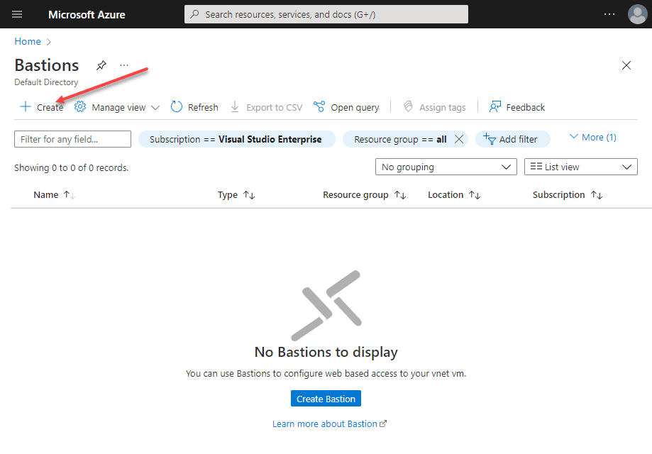 Search in the Azure portal for Bastion and it will bring up the Azure Bastions configuration. Click the Create button.