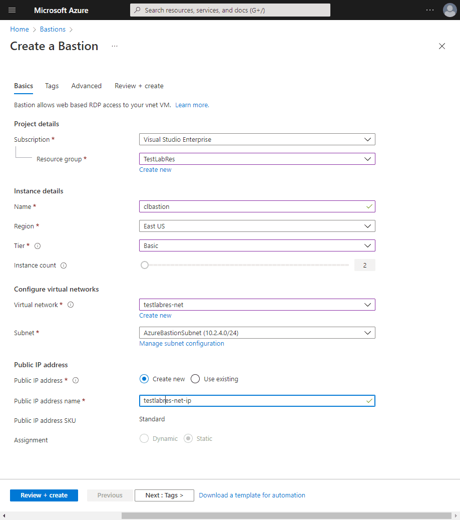 After the above configuration screen, you can next through the other screens unless you want to set up Tags and more granular network config, etc. The Azure Bastion host will spin up in just a few minutes.