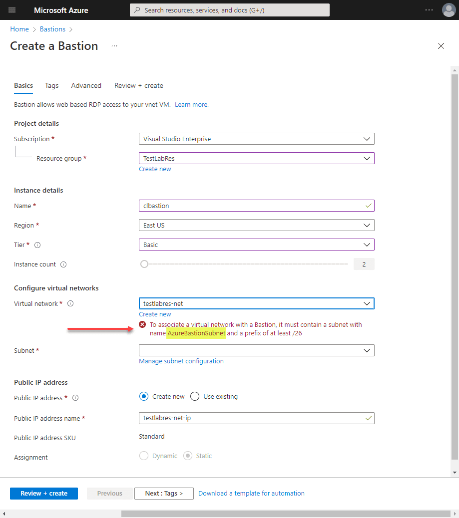 If you just quickly buzz through the blade to create a Bastion, you will most likely get an error on the virtual network section. One of the requirements of creating the Azure Bastion is you have a virtual network explicitly named AzureBastionSubnet.